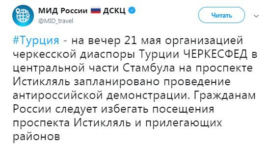 Читатели "Кавказского узла" обратили внимание на сообщение МИД России в твиттере о том, что 21 мая в Стамбуле пройдёт "антироссийская демонстрация черкесской диаспоры". "[МИД России] рекомендовал гражданам РФ избегать посещения этого района", - написал 20 мая в 23.02 мск автор сообщения "21 мая в Стамбуле пройдет демонстрация черкесской диаспоры", поступившего на SMS-сервис "Кавказского узла". "Кавказский узел" проверяет поступающие на SMS-сервис сообщения и публикует их в соответствующем разделе форума.