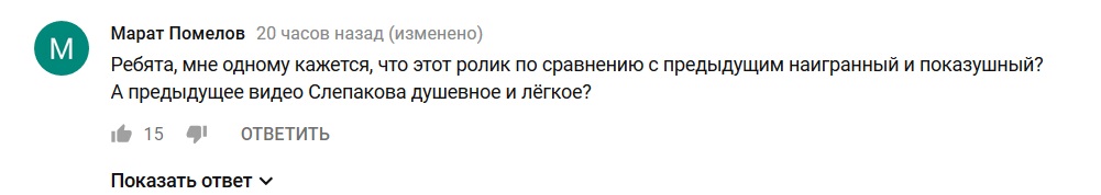 "Ребята, мне одному кажется, что этот ролик по сравнению с предыдущим наигранный и показушный? А предыдущее видео Слепакова душевное и лёгкое?" - написал Марат Помело.
