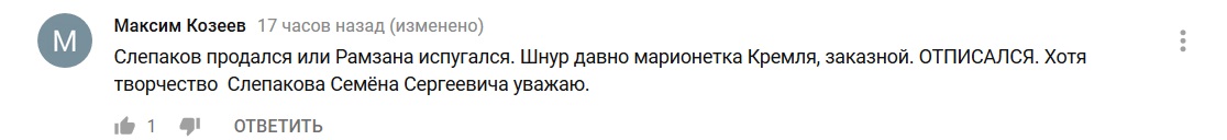 "Слепаков продался или Рамзана испугался. Шнур давно марионетка Кремля, заказной. Отписался. Хотя творчество Слепакова Семёна Сергеевича уважаю", - отметил Максим Козеев.