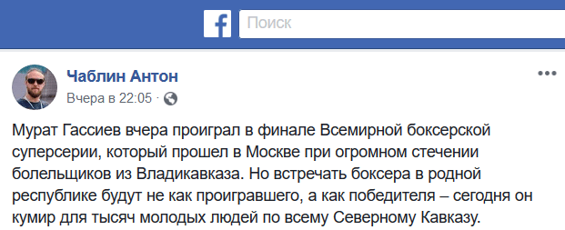 Несмотря на поражение в финале Всемирной боксерской суперсерии, Мурат Гассиев был тепло встречен сотнями болельщиков во Владикавказе. Проигрышный поединок с Александром Усиком обозначил слабости стиля молодого осетинского боксера, Гассиеву нужен опыт боев с разными соперниками до перехода в супертяжелый вес, отметили болельщики.