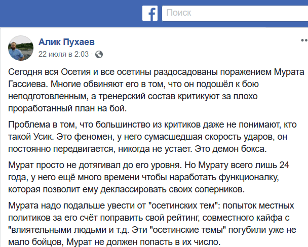 "Большинство из критиков даже не понимают, кто такой Усик. Это феномен, у него сумасшедшая скорость ударов, он постоянно передвигается, никогда не устает. Мурат просто не дотягивал до его уровня. Но Мурату всего лишь 24 года, у него еще много времени, чтобы наработать функционалку, которая позволит ему деклассировать своих соперников. Мурата надо подальше увести от "осетинских тем": попыток местных политиков за его счёт поправить свой рейтинг, совместного кайфа с "влиятельными людьми и т.д.", - написал блогер на своей странице в Facebook.