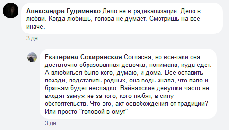 "Дело не в радикализации. Дело в любви. Когда любишь, голова не думает. Смотришь на все иначе", - возразила в комментарии к посту Сокирянской Александра Гудименко.