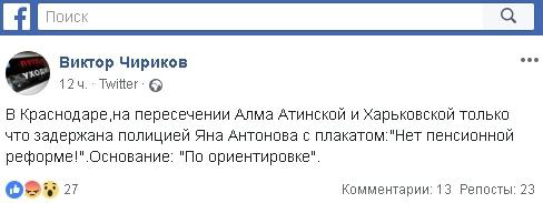 "В Краснодаре,на пересечении Алма Атинской и Харьковской задержана полицией Яна Антонова с плакатом:"Нет пенсионной реформе!", - в 15.00 мск написал Виктор Чириков.