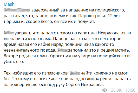 Ранее, 28 июля, источник Mash сообщал, что следователи изучают возможные личные мотивы нападения на пострадавшего полицейского, однако подозреваемый на тот момент еще не был задержан и допрошен.