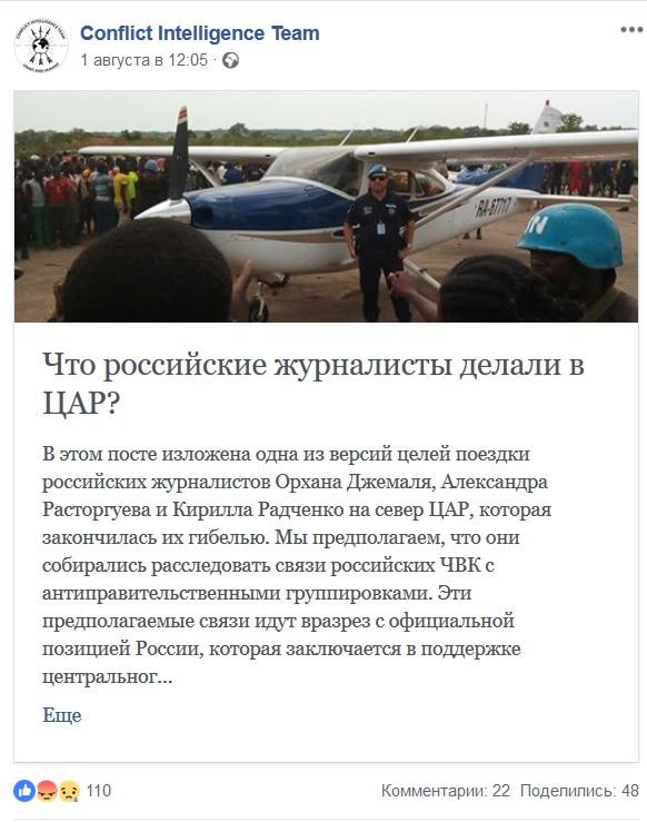 Независимая расследовательская группа Conflict Intelligence Team (CIT) 1 августа выдвинула версию о том, что убитые в ЦАР журналисты собирались изучить связи российских наемников с антиправительственными группировками. "Эти предполагаемые связи идут вразрез с официальной позицией России, которая заключается в поддержке центрального правительства Центральноафриканской Республики", - отмечается в расследовании, размещенном в аккаунте Conflict Intelligence Team в соцсети Facebook.
