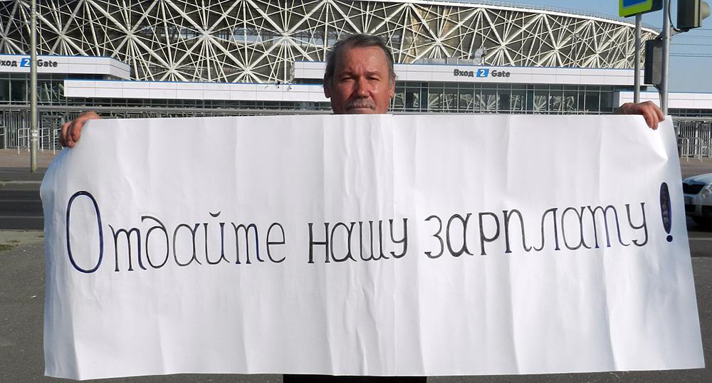 Как сообщал "Кавказский узел", бывшие строители стадиона "Волгоград-Арена", требующие выплаты долгов по зарплате, с 19 августа начали проводить одиночные пикеты в Волгограде. Первым на акцию с плакатом "Отдайте наши зарплаты" вышел Андрей Кузубов, а сегодня пикет провел Александр Малютин, который не получил зарплату за три месяца.
