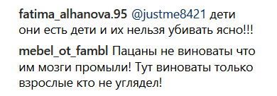 "Дети самые поддающиеся, ими проще управлять. Психика еще не сформирована. Этим упырям было проще взять в роль пушечного мяса детей, чем взрослого. Но я считаю, что убивать их не следовало. Все можно было исправить и наставить на путь, еще не поздно!!" - написал пользователь Instagram geoland.shop_uss.