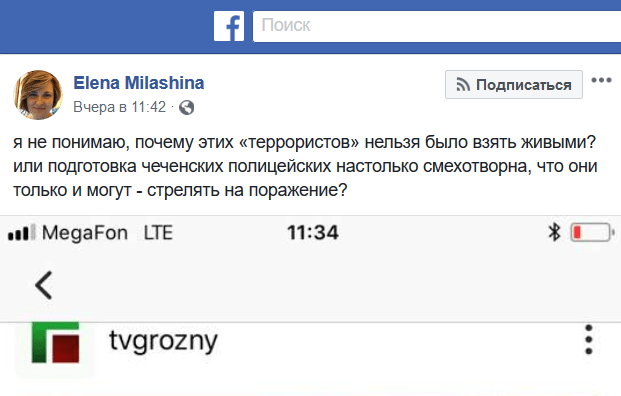 "Я не понимаю, почему этих «террористов» нельзя было взять живыми? или подготовка чеченских полицейских настолько смехотворна, что они только и могут - стрелять на поражение?" - написала журналистка "Новой газеты" Елена Милашина, комментируя кадр видео с присягой подростков и публикацию ЧГТРК "Грозный" на своей странице в Facebook.