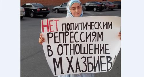 Младшая сестра и мать Хазбиева провели пикет напротив здания Магасского суда по улице Московской, развернув плакаты с надписями "Свободу Магомеду Хазбиеву" и "Нет политическим репрессиям в отношении Магомеда Хазбиева".