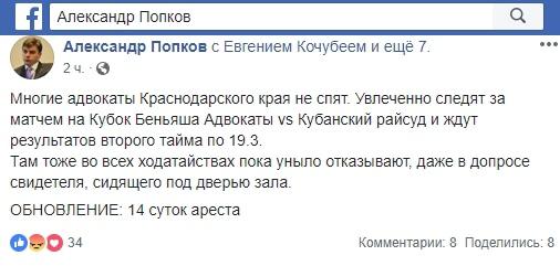 Позднее он же сообщил, что Беньяш арестован на 14 суток по статье 19.3 КоАП.