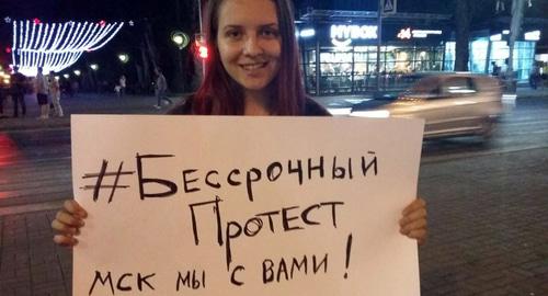Участники акции в Волгограде держали в руках плакаты «Респект бессрочному протесту в Москве» и «Сейчас в Москве идет #Бессрочный протест против пенсионной реформы».
