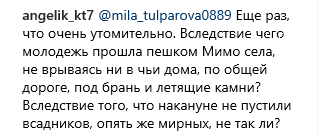 "Но мирный конный переход никого не мог задеть, так ведь? Почему нужно было ситуацию довести до конфликта? Вследствие чего молодежь прошла пешком мимо села, не врываясь ни в чьи дома, по общей дороге, под брань и летящие камни? Вследствие того, что накануне не пустили всадников, опять же мирных", - возразила angelik_kt7 .