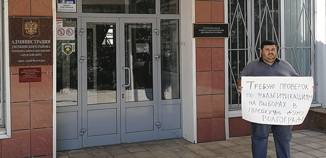 Сегодня с 13:30 до 14:40 мск Алексей Ульянов проводил одиночные пикеты у зданий облизбиркома, территориальной избирательной комиссии (ТИК) Дзержинского района Волгограда и областной прокуратуры. Активист стоял с плакатами "Почему факты нарушений на выборах не имеют реакции прокуратуры? Где надзор?" и "Требую проверок по фальсификациям на выборах в городскую думу Волгограда".