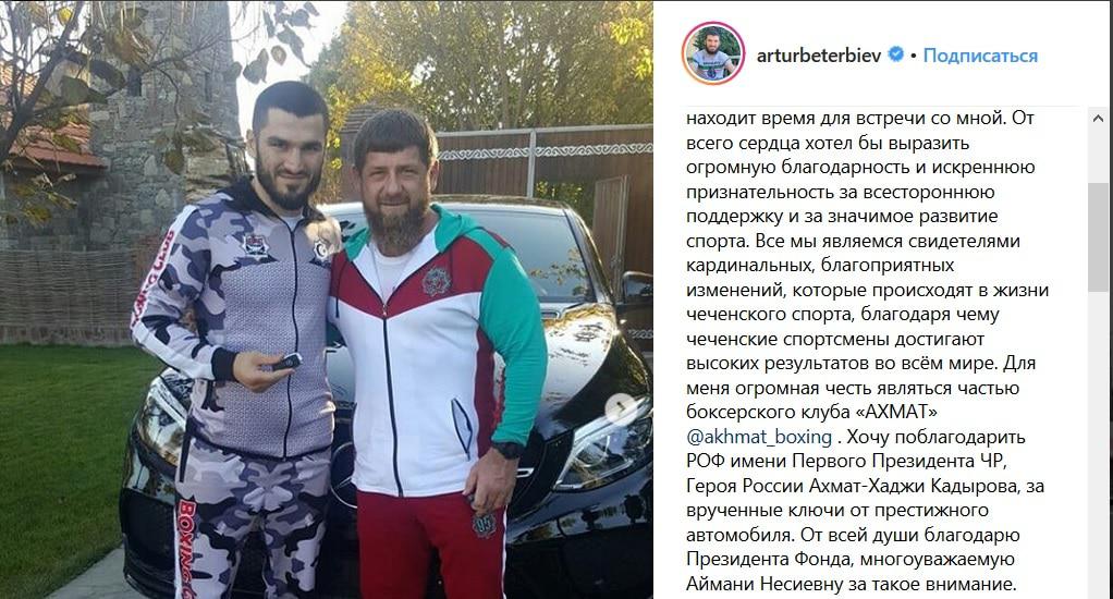 "От всего сердца хотел бы выразить огромную благодарность и искреннюю признательность за всестороннюю поддержку и за значимое развитие спорта. (...) Хочу поблагодарить РОФ имени первого президента Чечни, героя России Ахмата-хаджи Кадырова, за врученные ключи от престижного автомобиля", - написал 14 октября на своей странице в соцсети Instagram Артур Бетербиев, опубликовав фото на фоне машины.