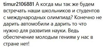 "А когда мы также будем встречать наших школьников и студентов с международных олимпиад? Конечно, не дарить автомобили, а дарить то, что нужно для развития науки. Ведь обеспечения молодым гениям у нас в стране нет!" - напомнил timur2106881.