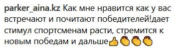 "Как мне нравится, как у вас встречают и почитают победителей! Дает стимул спортсменам расти, стремиться к новым победам и дальше", - написал пользователь с ником parker_aina.kz.