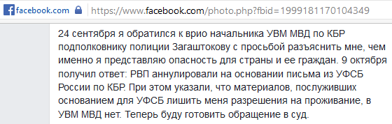 "24 сентября я обратился к врио начальника УВМ МВД по Кабардино-Балкарии подполковнику полиции Загаштокову с просьбой разъяснить мне, чем именно я представляю опасность для страны и ее граждан. 9 октября получил ответ, что РВП (разрешение на временное проживание) аннулировали на основании письма из УФСБ России по Кабардино-Балкарии. При этом указали, что материалов, послуживших основанием для УФСБ лишить меня разрешения на проживание, в УВМ МВД Кабардино-Балкарии нет", - написал Тарик Топчу.
