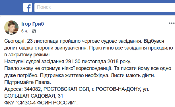 В конце июля Северо-Кавказский окружной военный суд вернул в прокуратуру дело Павла Гриба из-за допущенной обвинением процессуальной ошибки. Украинец был обвинен по редакции уголовного закона, которая не действовала на момент вменяемого ему деяния. Прокуратура изменила редакцию статьи, в остальном обвинительное заключение по делу Гриба осталось неизменным. 7 ноября суд продлил срок ареста до 24 апреля 2019 года.
