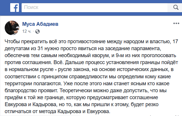 "Дальше процесс установления границы пойдёт в нормальном русле - русле закона, на основе исторических данных, в соответствии с принципом справедливости мы определим кому какие территории полагаются. Уже после этого нам станет ясным кто какое благородство проявит. Теоретически можно даже допустить, что мы придём к той же границе, которую предусматривает соглашение Евкурова и Кадырова, но то, как мы пришли к этому, будет резко отличаться от метода Кадырова и Евкурова", - написал Абадиев 29 ноября на своей странице в Facebook.