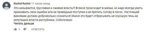 "Это называется, трусливая и лживая власть!!! Всякое происходит в жизни, но надо всегда уметь признавать свои ошибки или неправедные поступки, а не прятать голову в песок. Настоящий виновник должен добровольно сознаться! Иначе это будет отбрасывать нехорошую тень на репутацию власти республики. Соболезную родственникам погибших", - написал Rashid Rashid в комментариях под видео, выложенном Тумсо Ибрагимовым (Абдурахмановым - уточнение "Кавказского узла" от 16.30 24.12.2018 г.).