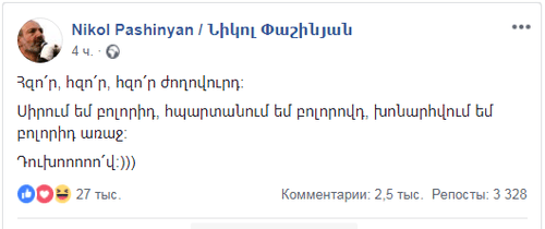 "Могучий, могучий, могучий народ. Люблю вас всех, горжусь вами и преклоняюсь", - написал сегодня Пашинян  на своей странице Facebook после  оглашения окончательных результатов выборов в парламент.