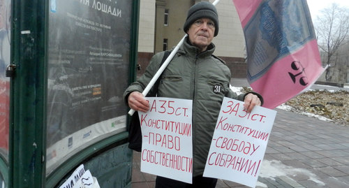 Васильченко также держал плакат с цитатой 35-й статьи Конституции, в которой говорится о праве собственности. Как пояснил активист, он являлся вкладчиком Сбербанка СССР и потерял свои сбережения. "Мы имеем право собственности, в том числе на наши вклады, которые нам отказались вернуть. В нынешних деньгах я потерял 3 миллиона 200 тысяч рублей", - отметил пикетчик.
