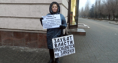Пикетчица Наталья Дорожнова объяснила свое участие в акции несогласием с политикой Путина. "Он уже несколько сроков находится у власти, а по Конституции этого делать нельзя, можно быть не более двух сроков подряд. Две пенсионерки раскритиковали меня, они защищают Путина. Прохожий мужчина жаловался, что ему нечем платить за квартиру и за дачу", - рассказала она корреспонденту "Кавказского узла".