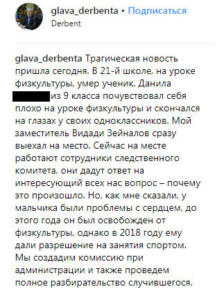 "Как мне сказали, у мальчика были проблемы с сердцем. До этого года он был освобожден от физкультуры, однако в 2018 году ему дали разрешение на занятия спортом. Мы создадим комиссию при администрации и также проведем полное разбирательство случившегося", – отметил Абакаров на своей странице в Instagram.