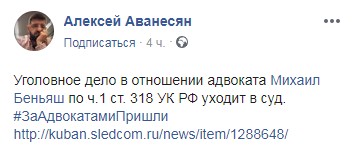 "Уголовное дело в отношении адвоката Михаил Беньяш по ч.1 ст. 318 УК РФ уходит в суд", - написал Алексей Аванесян у себя на странице в Facebook.