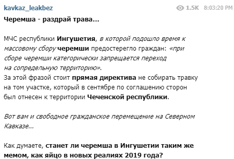 МЧС Ингушетии в связи с началом сезона сбора черемши опубликовало сообщение, в котором говорится о категорическом запрете жителям республики переходить при сборе растений "на сопредельную территорию".