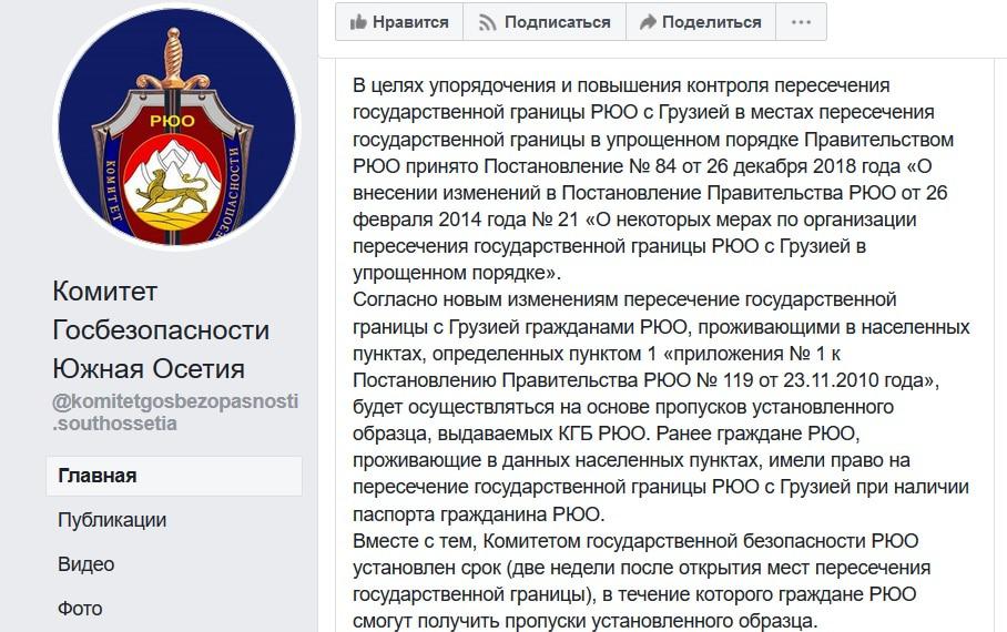"Согласно новым изменениям, пересечение государственной границы с Грузией гражданами РЮО будет осуществляться на основе пропусков установленного образца, выдаваемых КГБ. Ранее граждане РЮО имели право на пересечение государственной границы с Грузией при наличии паспорта", - говорится в сегодняшнем сообщении, размещенном на странице КГБ Южной Осетии в Facebook.