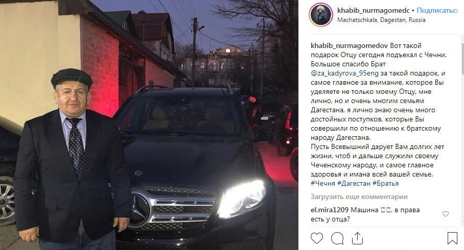 Отец и тренер дагестанского бойца Хабиба Нурмагомедова поблагодарил главу Чечни за автомобиль Mercedes, подаренный фондом имени Ахмата Кадырова. Некоторые жители Чечни и пользователи соцсетей сочли неуместными роскошные жесты властей на фоне бедности в республике.