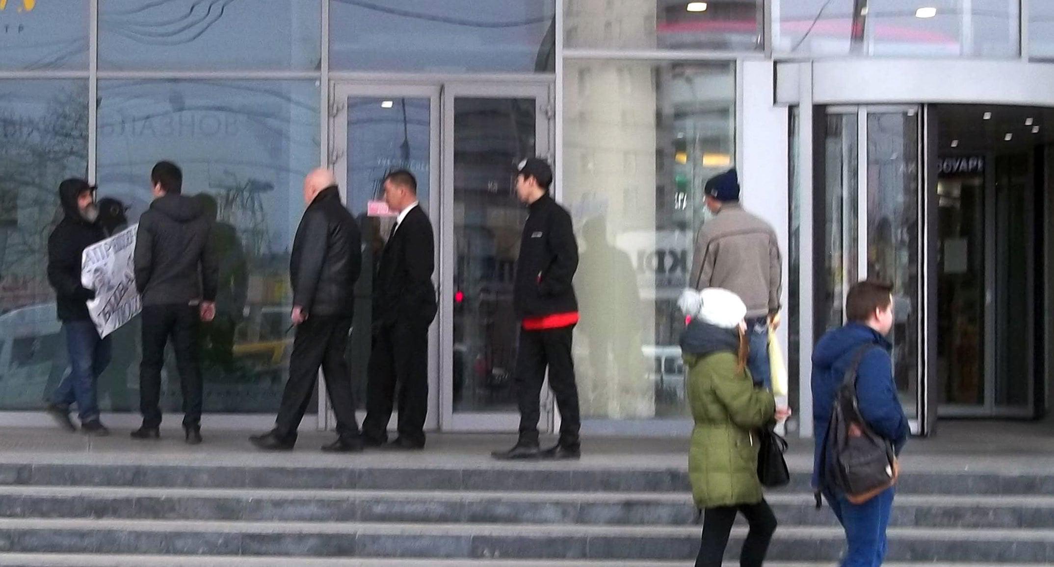 Серия одиночных пикетов около торгового центра на Вокзальной площади, в одной из самых оживленных точек города, началась в 14.00 по местному времени (13.00 мск). Почти сразу пикетчику Михаилу Анисенко попыталась помешать охрана ТЦ.