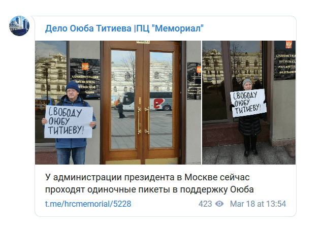 Активисты стояли у здания администрации президента с плакатом "Свободу Оюбу Титиеву!", сменяя друг друга, следует из сообщения в Telegram-канале ПЦ "Мемориал".