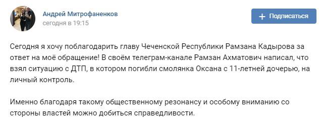 Сегодня Митрофаненков поблагодарил Кадырова, посчитав, что слова главы Чечни были ответом на его обращение. "В своём телеграм-канале Рамзан Ахматович написал, что взял ситуацию с ДТП, в котором погибли смолянка Оксана с 11-летней дочерью, на личный контроль. Именно благодаря такому общественному резонансу и особому вниманию со стороны властей можно добиться справедливости", - написал сегодня в 19.15 мск Андрей Митрофаненков.