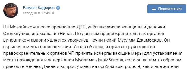 Правоохранители считают виновником аварии уроженца Чечни Муслима Джамбекова, который скрылся с места происшествия, сообщил сегодня Рамзан Кадыров.
