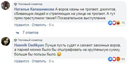 "А воров казны не трогают, джигитов, сбивающих людей и стреляющих на улице не трогают. А тут прям преступники такие!! Показательное выступление", - считает и Наталья Калашникова.
