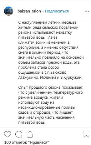 В преддверии летнего сезона власти Баксанского района Кабардино-Балкарии призвали жителей не расходовать воду на полив садов и огородов, чтобы избежать проблем с питьевой водой. Селяне напомнили, что воды не хватает не только летом, и предложили чиновникам развивать арычное водоснабжение.