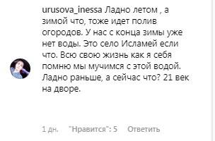 "Ладно, летом, а зимой что, тоже идет полив огородов? У нас с конца зимы уже нет воды. Это село Исламей", - возмутилась urusova_inessa. По ее словам, на ее памяти проблема с водой в селе существовала всегда.