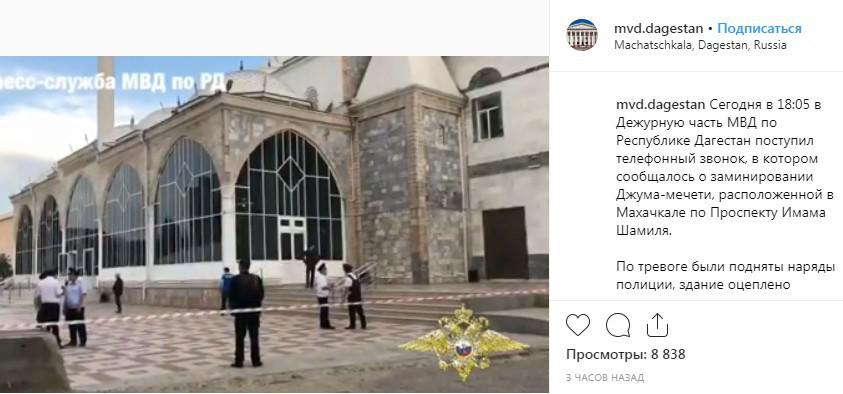 Сообщение о минировании джума-мечети, расположенной в Махачкале по проспекту Имама Шамиля, поступило в 18:05 мск в дежурную часть МВД по Республике Дагестан по телефону. Оно оказалось ложным, говорится на странице МВД Дагестана в Instagram.