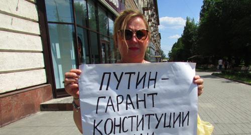 В 50 метрах от Заболотневой стояла индивидуальный предприниматель Елена Шеина. Она держала плакат с вопросом о том, является ли Владимир Путин гарантом Конституции. "Наше требование – соблюдать Конституцию страны. Любую статью Конституции можно взять [в качестве примера] - она не исполняется. Хотя Конституция является законом прямого действия", - сказала активистка корреспонденту "Кавказского узла".