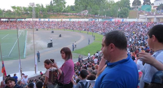 Зрители возле стадиона в Степанакерте. Фото Алвард Григорян для "Кавказского узла"Наталья Григорян рассказала корреспонденту "Кавказского узла" что вместе с детьми посетила матч между Нагорным Карабахом и Сапми на степанакертском стадионе.