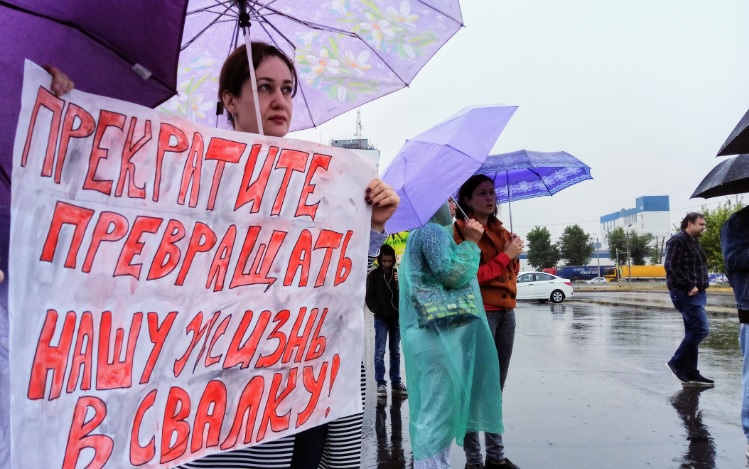 Митингующие держали плакаты с надписями: "Не везите мусор под наши окна!", "Прекратите превращать нашу жизнь в свалку!", "Россия - не помойка!", "Дым свалки затмил наше небо" и другие.