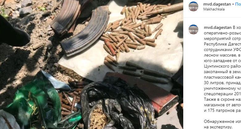 По информации ведомства, схрон был спрятан в лесу, в двух километрах юго-западнее от села Вициятли Цунтинского района. В тайнике были обнаружены пластмассовая канистра емкостью 30 литров, а также девять магазинов от автомата Калашникова и 175 патронов разного калибра, говорится в сегодняшнем сообщении, размещенном на странице МВД Дагестана в Instagram.