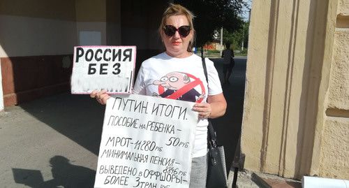 Пикеты пяти активистов прошли сегодня на проспекте Ленина, передал корреспондент "Кавказского узла" с места событий. Активистка Елена Шеина стояла с плакатом "Путин. Итоги. Пособие на ребенка 50 руб., МРОТ – 11280 руб., минимальная пенсия – 8846 руб., выведено в оффшоры – более 3 трлн руб.».