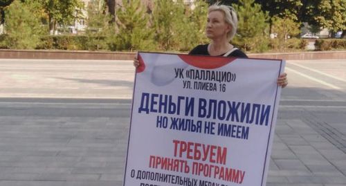 "Я дольщица самостроя по переулку Весенний в Батайске. В 2013 году купила у застройщика однокомнатную квартиру на стадии котлована, но дом он так и не построил. В 27-квартирном доме было продано около 50 квартир. В итоге застройщика посадили, а я осталась без денег и квартиры, так как продала свое единственное жилье. Я инвалид второй группы, но вынуждена работать, на почве стресса перенесла две операции. Живу у родственников, покупать новую квартиру денег нет, еле свожу концы с концами", - рассказала пикетчица Марина Заварзина, приехавшая из Батайска, корреспонденту "Кавказского узла".
