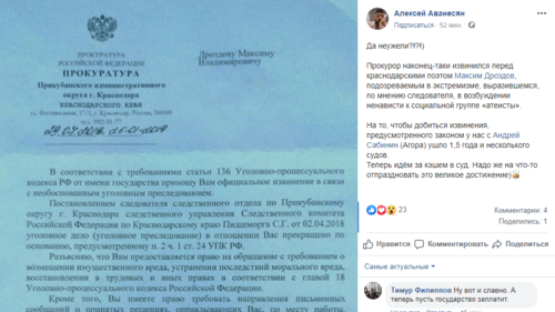 "От имени государства приношу Вам официальное извинение в связи с необоснованным уголовным преследованием", - говорится в письме прокурора Прикубанского административного округа Краснодара Игоря Бондара Максиму Дроздову, опубликованном сегодня в Facebook адвокатом Алексеем Аванесяном.