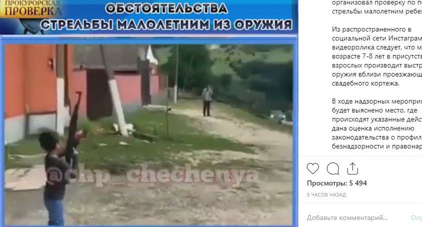 "Из распространенного в социальной сети Instagram видеоролика следует, что мальчик в возрасте 7-8 лет в присутствии взрослых производит выстрелы из оружия вблизи проезжающего свадебного кортежа", - говорится в сообщении прокуратуры Чечни. Правоохранители намерены выяснить место, где стрелял ребенок. Будет дана оценка исполнению законодательства о профилактике безнадзорности и правонарушений несовершеннолетних, говорится в сообщении на странице прокуратуры Чечни в соцсети Instagram.
