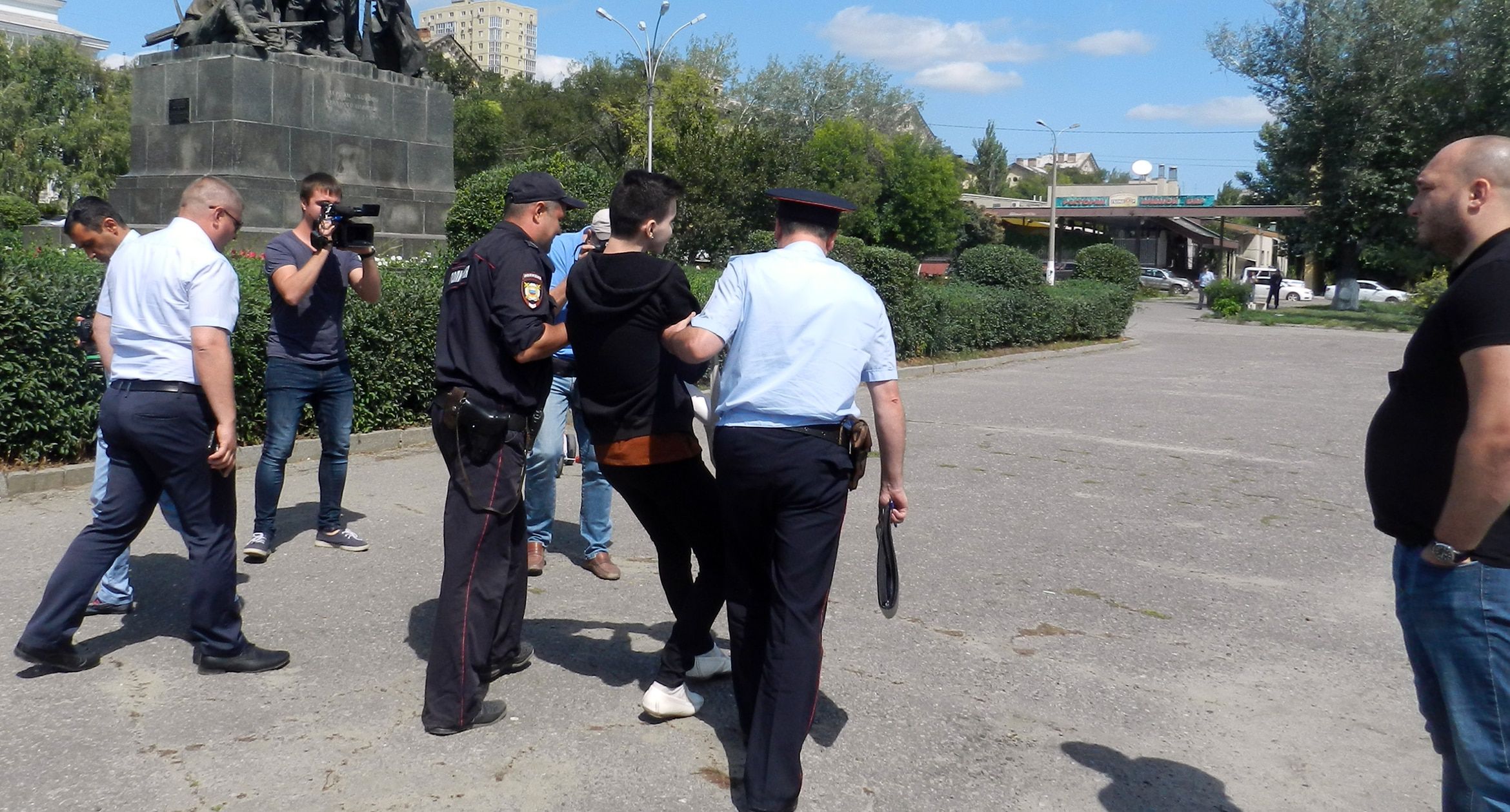 К освещению ситуации присоединились журналисты еще нескольких СМИ. В это время на площади появился ЛГБТ-активист Владислав Погорелов со свернутым плакатом в сумке. После диалога Погорелова с участниками согласованной акции, сотрудники полиции увели ЛГБТ-активиста с площади. Через некоторое время на площадь пришли еще несколько представителей гей-движения, на лице одной из ЛГБТ-активисток был нарисовал радужный флаг. Сотрудник полиции попросил активистов показать документы и проехать в отдел полиции. Одна из девушек заявила, что гуляет по площади. По словам, полицейского на активистов поступило заявление. После этого с площади увели еще несколько активистов, сообщил корреспондент "Кавказского узла" с места событий.