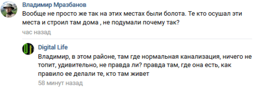 "Владимир, в этом районе, там, где нормальная канализация, ничего не топит, удивительно, не правда ли? Правда, там, где она есть, как правило, ее делали те, кто там живет", - ответил пользователь под ником Digital Life.
